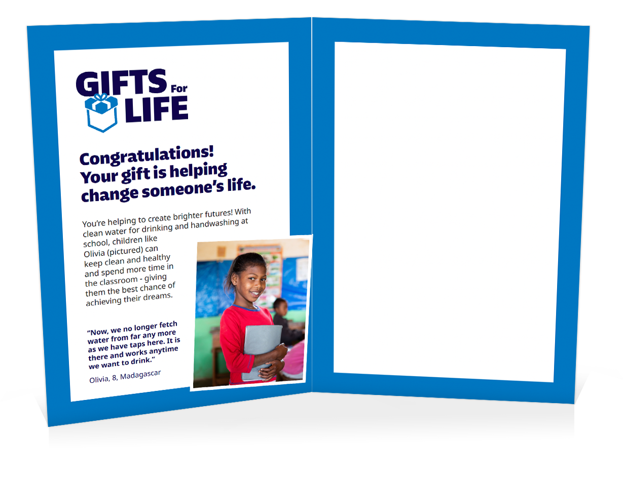 You're helping to create brighter futures! With clean water for drinking and handwashing at school, children like Olivia (pictured) can keep clean and healthy and spend more time in the classroom - giving them the best chance of achieving their dreams.